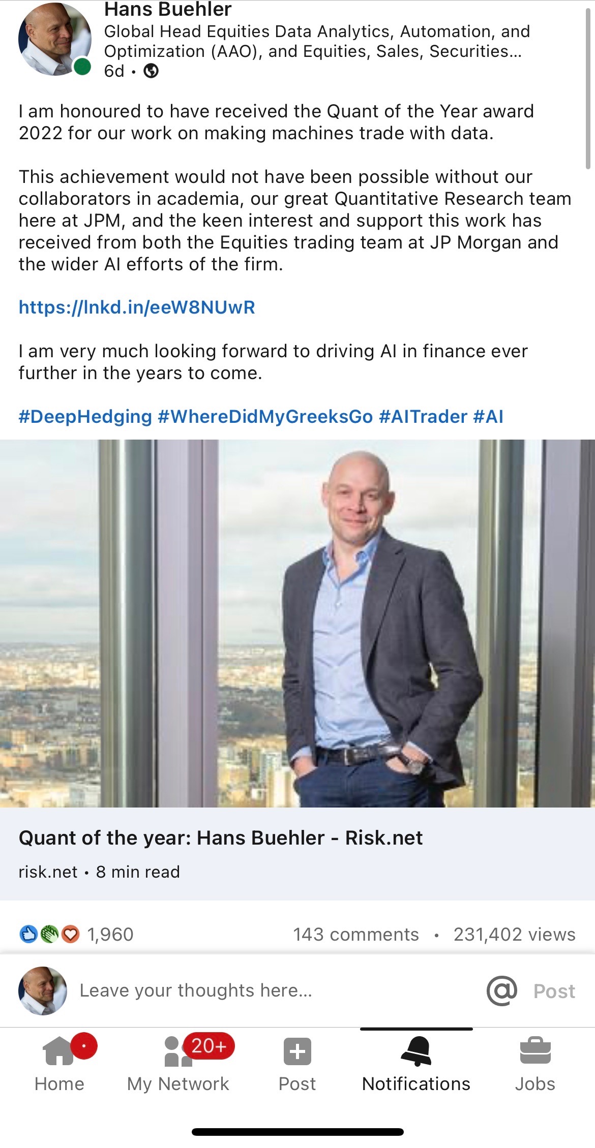 My primary focus until 2022 was the use of modern quant finance, data-driven, and AI methods for financial applications in markets with a strong focus on reinforcement learning for execution, market making, derivatives risk management and pricing/quoting to drive client business. The use of big data and cloud compute technology allows pushing forward the barrier from analytics, automation to optimization accross the Equities and markets businesses.